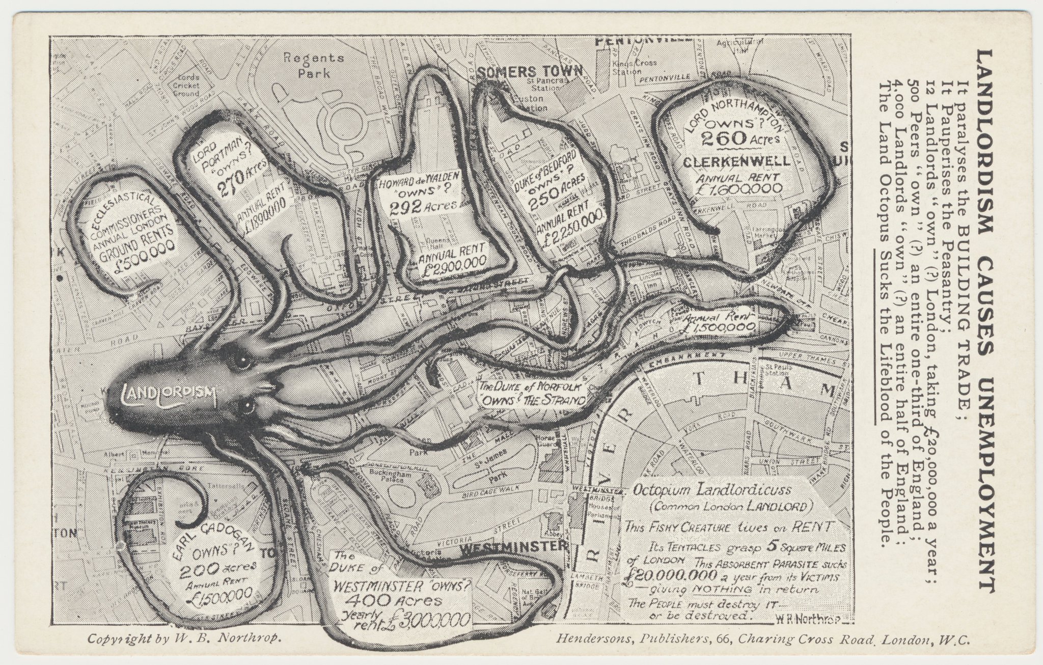 depicting a giant octopus, labelled ‘landlordism’, spreading its